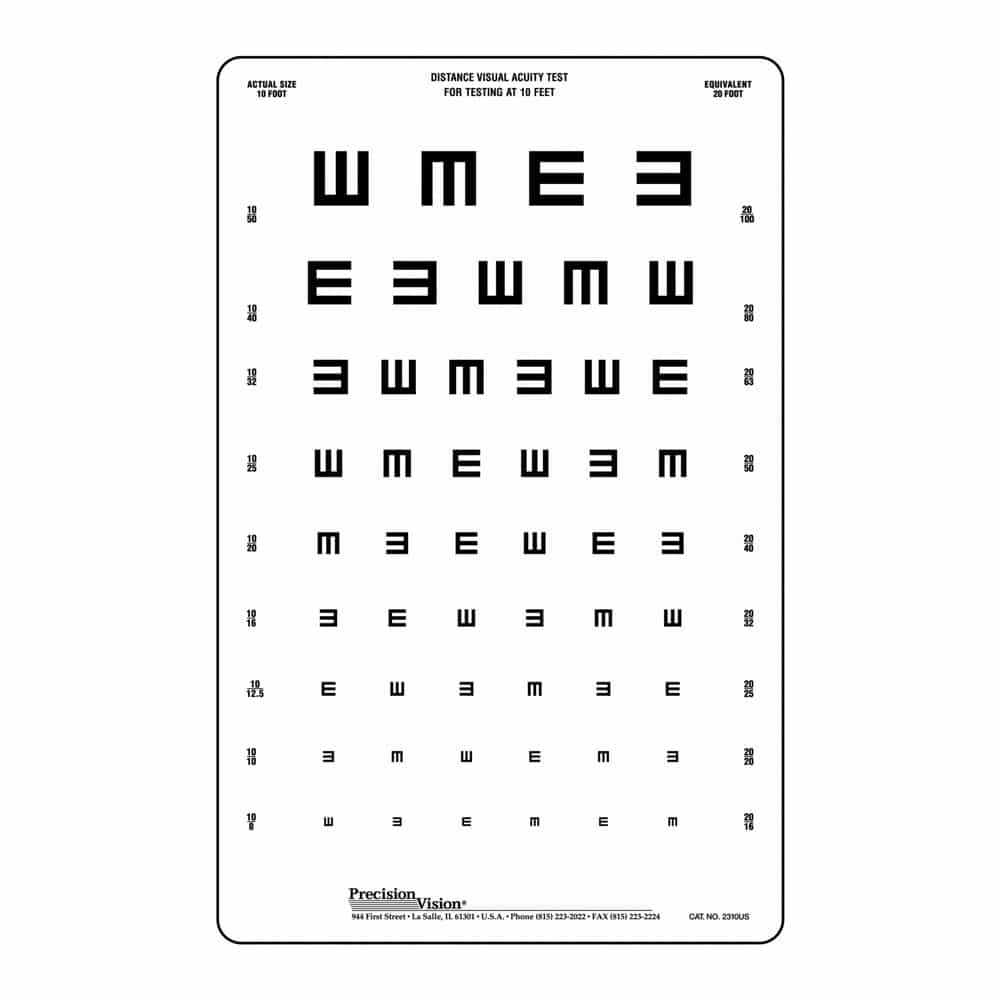 ۲. فاصله استاندارد: برای تست دور معمولاً ۲ تا 6 متر (یا 20 فوت در نسخههای انگلیسی) و برای تست نزدیک معمولاً فاصله خواندن عادی (۳۰–۴۰ سانتیمتر) رعایت شود. (شرح فنی در بخش توضیح چارتها). NCBI